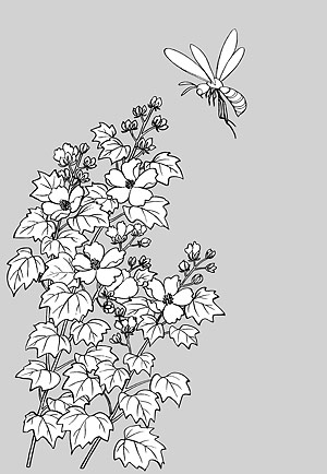 Description:Japanese line drawing of plant flowers vector material -15 (bees and hibiscus flower)